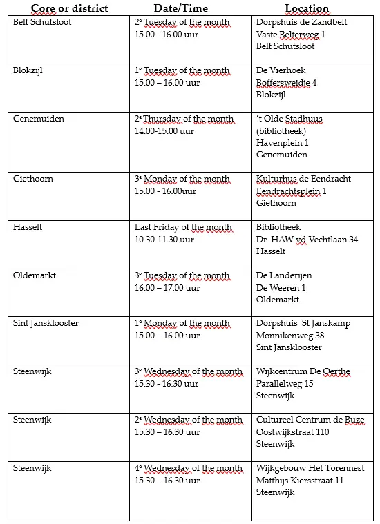 We are currently not holding office hours in Eesveen, Kuinre, Scheerwolde, and Vollenhove. However, we are regularly present there. Feel free to stop by if you see us.